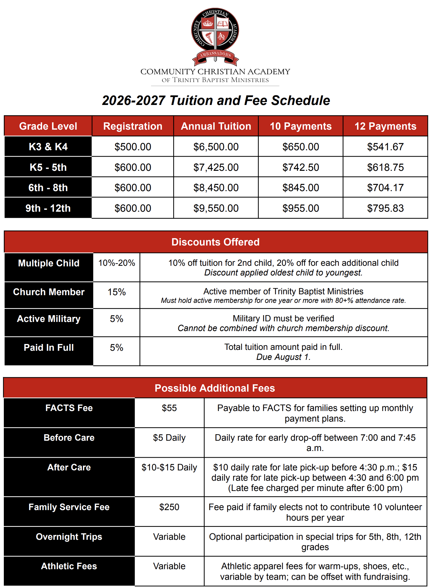 At Community Christian Academy, we strive to make a Christ-centered education accessible and affordable for families. Our tuition rates are designed to reflect our commitment to providing high-quality education while being mindful stewards of the resources God has entrusted to us. We work diligently to manage our finances responsibly, ensuring that every dollar is used effectively to enhance the learning environment and support our students' growth. Additionally, we offer a select number of scholarship opportunities to assist families who may need financial support, helping to ensure that a Community Christian Academy education remains within reach for those who value our mission and vision.
